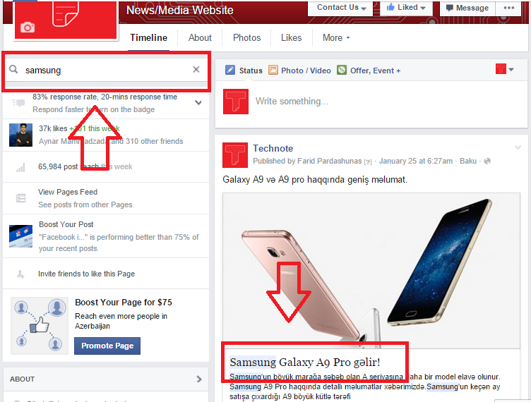 Artıq sizə lazım olan səhifəyə daxil olduqda əsas səhifənin sol yuxarı hissəsində axtarış bölməsi əlavə olub. Bu axtarış paneli vasitəsilə sizə laım olan açar sözü daxil edib, həmin sözlərə uyğun məlumatları tapa bilirsiniz. Məsələn: biz öz səhifəmizdə Açar kəlimə olaraq samsungdan istifadə etdik və avtomatik olaraq sol tərəfdə samsunga aid olan xəbərlər çıxdı. Lakin qeyd etmək lazımdır ki, sözü gedən funksiya hal hazırda web facebook üçün keçərlidir. Tezliklə mobil platformaya da gələcəyi düşünülür.