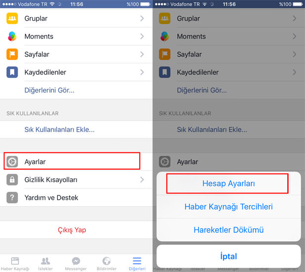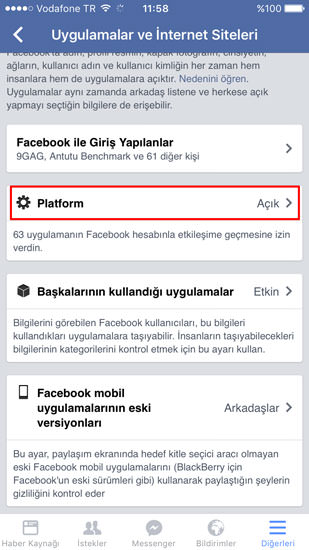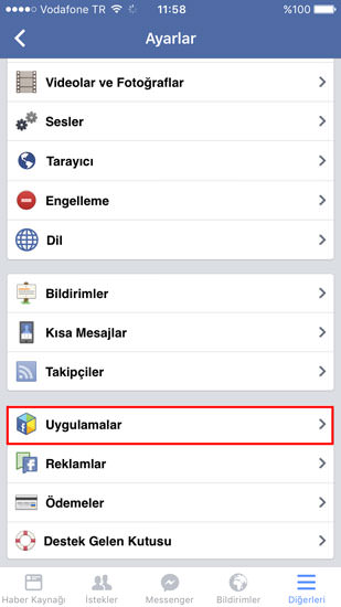 1. Facebook tətbiqinə daxil olub "settings"ə klik edirik.