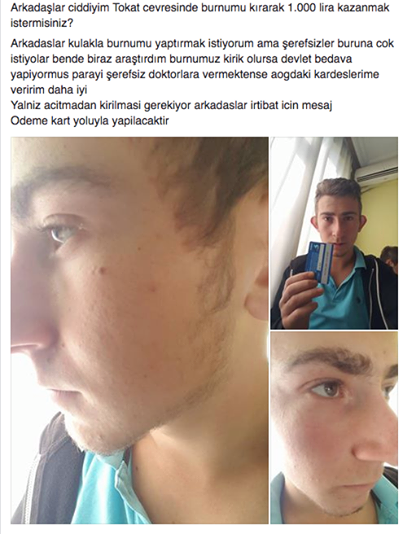 Burnunu "ödənişsiz” əməliyyat etdirmək üçün zarafata yazdığı "burnumu qıraraq 1000 TL qazanmaq istəyərsiniz?” sualını ciddiyə alan bir nəfər, gənci taparaq həqiqətən burnunu qırdı.
