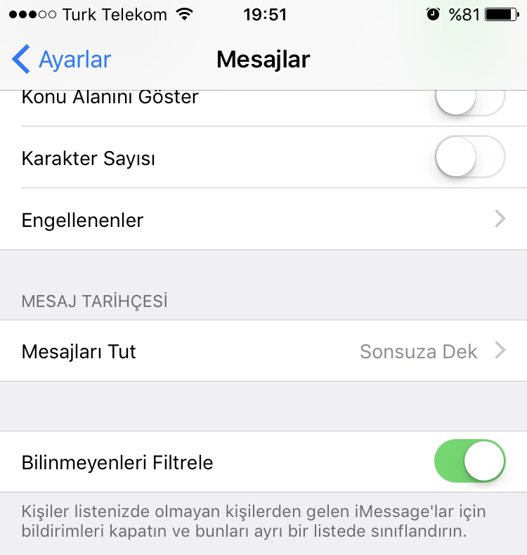 Kontaktınızda qeyd olmayan şəxslərin iMessage üzərindən göndərdiyi mesajların filtrlənməsinə şərait yaradaraq, bu problem üçün təsirli bir həll tapa bilərsiniz.