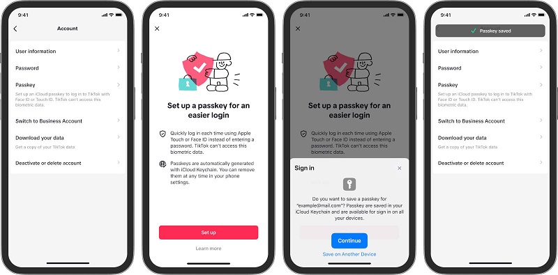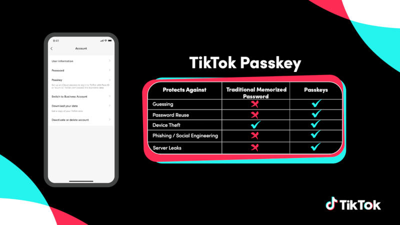 TikTok iPhone-larda öz platformasına yeni təhlükəsiz giriş üsulunu anons edib. Bundan sonra iOS istifadəçiləri TikTok hesablarına Touch ID və ya Face ID vasitəsilə daxil ola biləcəklər. Bu üsul çərçivəsində adi şifrənin daxil edilməsinə ehtiyac qalmadığı üçün istifadəçi hesablarının fişinq (phishing) kiberhücumu vasitəsilə oğurlanma cəhdləri mənasız olurlar. TikTok hesabına Touch ID və ya Face ID vasitəsilə daxil olmanı mümkün edən giriş açarı iCloud Keychain-də saxlanılır. Giriş açarının təyin olunması TikTok daxilindəkı ayarlar vasitəsil müvafiq funksiyanın aktivləşdirilməsi halında mümkün olur.