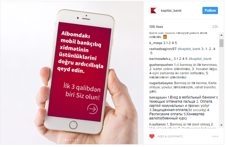 Sosial Media kanallarında bir-birilərilə rəqabət aparan şirkətlər yeniliklərdən və trendlərdən geri qalmırlar. Bu baxımdan Instagram-ın yeni funksiyasından istifadə edərək izləyiciləri üçün yarışma təşkil edən şirkət profillərindən birincisi "Kapital Bank" oldu. "Endorphin" Agentliyi ilə ərsəyə gətirilən bu yraışmada istifadəçilərdən mobil bankçılıq xidmətinin üstünlüklərinin doğru ardıcıllıqla sıralanması istənilir. Ardıcıllığı düzgün tapan ilk 3 izləyici isə "Kapital Bank"dan hədiyyə paketi qazanıb. Müsabiqə ilə ətraflı buradan tanış ola bilərsiniz.