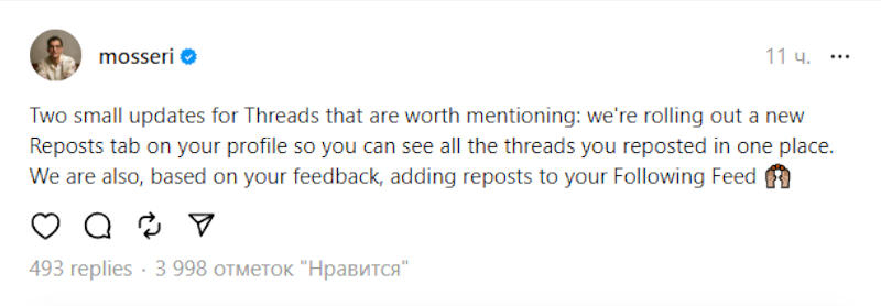 Meta-nın Twitter analoqu olan Threads-də paylaşımların repost olunması funksiyası istifadəyə verilib. Instagram-ın rəhbəri Adam Mosseri-nin sözlərinə əsasən repost olunmuş paylaşımlar xronoloji səhifədə və repostlar üçün nəzərdə tutulmuş xüsusi qovluqda əks olunurlar. Threads-də repost funksiyasının istifadəyə verilmə vacibliyi açıq aydın görünür. Çünki bu funksiya demək olar hər bir sosial şəbəkədə mövcuddur. Threads-in mobil tətbiqində repost qovluğu hələ aktiv deyil. Lakin yaxın günlərdə həmin qovluq da istifadəyə veriləcək. Qeyd etmək lazımdır ki, Meta hal hazırda Threads-in veb versiyası üzərində də çalışır. Veb versiyanın yaxın aylar ərzində istifadəyə veriləcəyi gözlənilir.