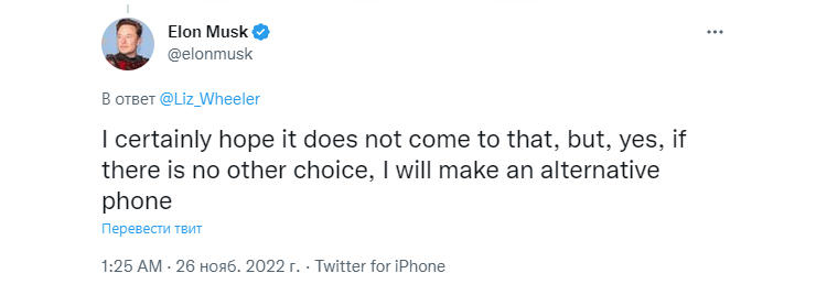 Bununla belə onun fikirlərinə əsasən ABŞ vətəndaşlarının yarısı bu halda casusluq edən iPhone və Android smartfonlardan rahatlıqla imtina edə bilər. Musk isə jurnalistin bu paylaşımına cavab olaraq qeyd edib ki, sosial şəbəkənin App Store və Google Play-dən silinəcəyi halda o öz smartfonunu satışa çıxartmağa məcbur olacaq. Musk bu cür variantı istisna etməsə də, onu ən son çarə kimi görür. “Ümid edirəm ki, vəziyyət bu həddə kimi çatmaz. Lakin bunun olacağı halda bəli, mən alternativ smartfonu satışa çıxardacam” - deyə Musk qeyd edib.