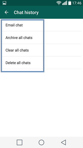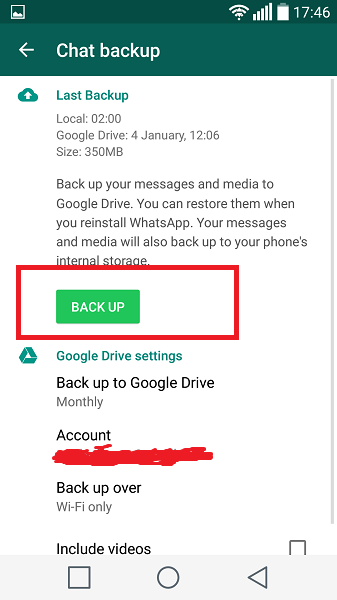 - "Chat backup" seçərək bütün məlumatlarımızı "back up" vasitəsilə google drive-a yükləyirik. Beləliklə məlumatlar silinəndə yenidən bərpa etmək mümkün olur.