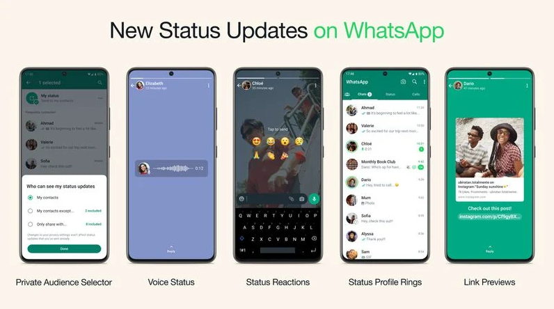 Yenilənmiş Whatsapp-da səsli statuslar funksiyası istifadəyə verilib. Bundan sonra istifadəçilər 30 saniyəlik səsli qeydləri status formatında messencer daxilində paylaşa biləcəklər. Bundan əlavə olaraq bundan sonra statuslara reaksiyalar da bildirmək mümkün olacaq. Baxılan bu və ya digər statusa reaksiya bildirmək üçün sadəcə olaraq status pəncərəsində yuxarı istiqamətə sürüşdürmə əməliyyatını reallaşdırmaq lazımdır. Hal hazırda statuslara reaksiyaların bildirilməsi üçün nəzərdə tutulmuş 8 ədəd smaylik aktivdir. Lakin müəyyən müddətdən sonra onların sayı artacaq. İstifadəçi hesablarındakı status halqası daha bir yenilikdir.