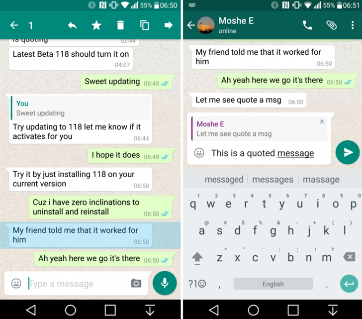 Facebook tərəfindən alınandan sonra daima yenilənən platforma öz istifadəçi kütləsini də artırmağa davam edir. Son olaraq WhatsApp-ın hərəkətli şəkilləri də dəstəkləyəcəyi haqqında məlumat vermişdik. Bu dəfə şirkət Beta versiya üçün növbəti yenilənməni təqdim edib. Sözügedən yenilənmə bizə "twitter"-dən yaxın tanış olan "quoted" xüsusiyyətidir. Bu yenilik vasitəsilə artıq sizə gələn mesajı həmin adama yenidən göndərə biləcəksiniz. Bunun üçün onu "screen" etməyə ehtiyac olmayacaq. Bu əsasən yazışmalarda yuxarıda qalan mesajları təkrar göndərmək yaxud nəyisə sübut etmək istəyəndə bizim köməyimizə çatacaq. Belə olan halda mesajın sahibi barədə məlumat da qarşı tərəfə ötürülür. (əsas yenilik də budur) Hal hazırda bütün istifadəçilərdə açıq olmayan bu funksiya yalnız WhatsApp 2.16.118 Beta versiyasında aktiv haldadır. Bu xüsusiyyəti maraqlı edən digər amillərdən biri də, mesajlarla yanaşı sizə gələn faylları da qarşı tərəfə yönəldə bilirsiniz.