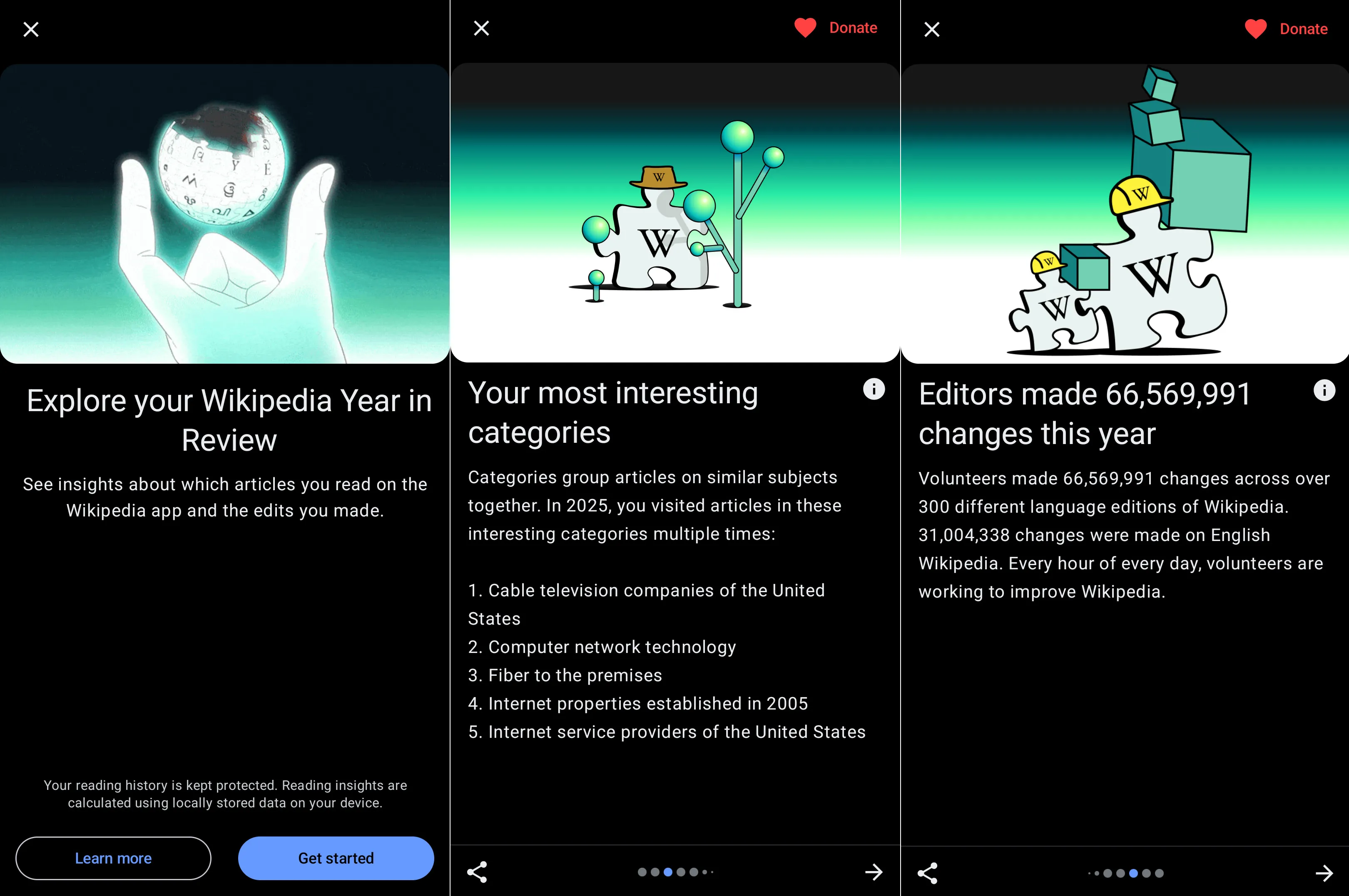 Şəxsi statistikanı təqdim etməklə yanaşı, funksiya ümumilikdə Wikipedia-da ilin necə keçdiyini də vizual və cəlbedici formatda nümayiş etdirir. Şirkətin məlumatına görə, il ərzində könüllü redaktorlar platformada 66 milyondan çox dəyişiklik ediblər.
