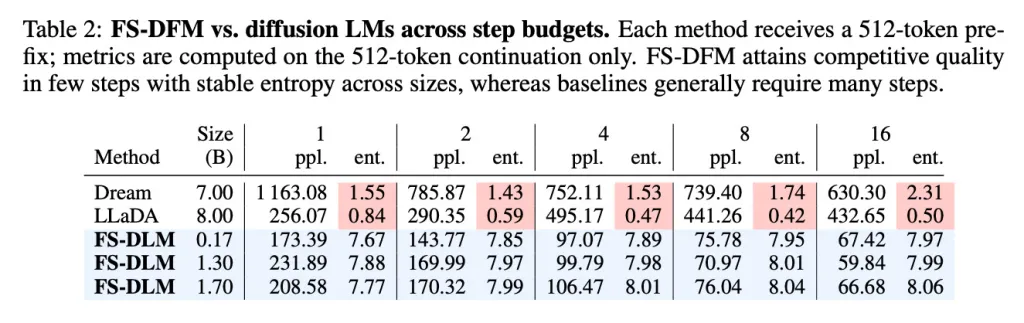 Daha böyük diffuziya modelləri ilə müqayisədə FS-DFM iki əsas göstərici - perpleksiya və entropiya üzrə yaxşı nəticələr göstərib. Perpleksiya göstəricisi dil modellərində mətnin keyfiyyətini əks etdirir. Bu göstərici nə qədər aşağı olarsa, mətn bir o qədər dəqiq və təbii səslənir. Entropiya isə modelin hər sözü nə dərəcədə inamla seçdiyini göstərir. Əgər entropiya çox aşağıdırsa, mətn təkrarlanan və ya asanlıqla proqnozlaşdırılan ola bilər. Əgər çox yüksəkdirsə, mətn əlaqəsiz və təsadüfi sözlər toplusu kimi görünə bilər. 7 milyard parametrli Dream və 8 milyard parametrli LLaDA diffuziya modelləri ilə müqayisədə, 1.7 milyard, 1.3 milyard və 0.17 milyard parametrə malik FS-DFM variantları bütün iterasiyalar ərzində daha aşağı perpleksiya və daha stabil entropiya təmin edib. Tərtibatçılar bildirib ki, modelin kodunu və yoxlama nöqtələrini (checkpoints) paylaşmağı planlaşdırırlar ki, bu da nəticələrin təkrarlanmasını və gələcək tədqiqatları asanlaşdırsın.