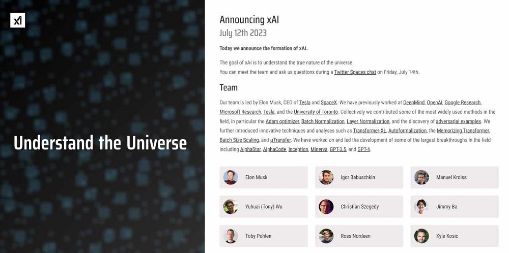 Aprel ayında baş tutmuş müsahibələrdən birində Musk etiraf etmişdi ki, o, kainatın əsl təibətinin başa düşülməsində yardımçı olacaq süni zəkanın yaradılması üçün nəzərdə tutulmuş yeni startapı təsis etmək istəyir. Yeni təsis edilmiş xAI adlı şirkət barəsində məlumat hələ çox azdır. Şirkətin saytında qeyd edilib ki, onun komandası bu həftənin cümə günü Twitter Spaces-də audio çat keçirtməyi planlaşdırır. Planlaşdırılan audio çatda çox güman ki, şirkət təmsilçiləri onun fəaliyyət sahəsi və məqsədləri barəsində daha çox məlumat verəcəklər.