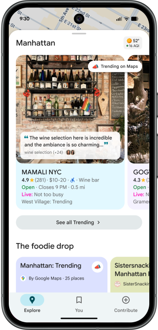 Google, həmçinin Explore nişanını yeniləyərək yaxınlıqda trend olan məkanları tapmağı daha sürətli və rahat hala gətirib. İstifadəçilər sadəcə ekranda yuxarı sürüşdürməklə: