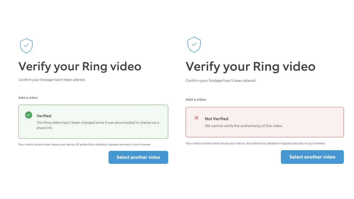 Bütün Ring buludundan yüklənən videolara indi “rəqəmsal təhlükəsizlik möhürü” əlavə edilir. İstifadəçilər Ring Verify veb-saytına video yükləyərək onun orijinal olub-olmadığını yoxlaya bilirlər. Əgər video “verified” statusu alırsa, bu, videonun Ring-dən yükləndikdən sonra heç bir dəyişiklik edilmədiyini göstərir. Sistem C2PA standartları üzərində qurulub.