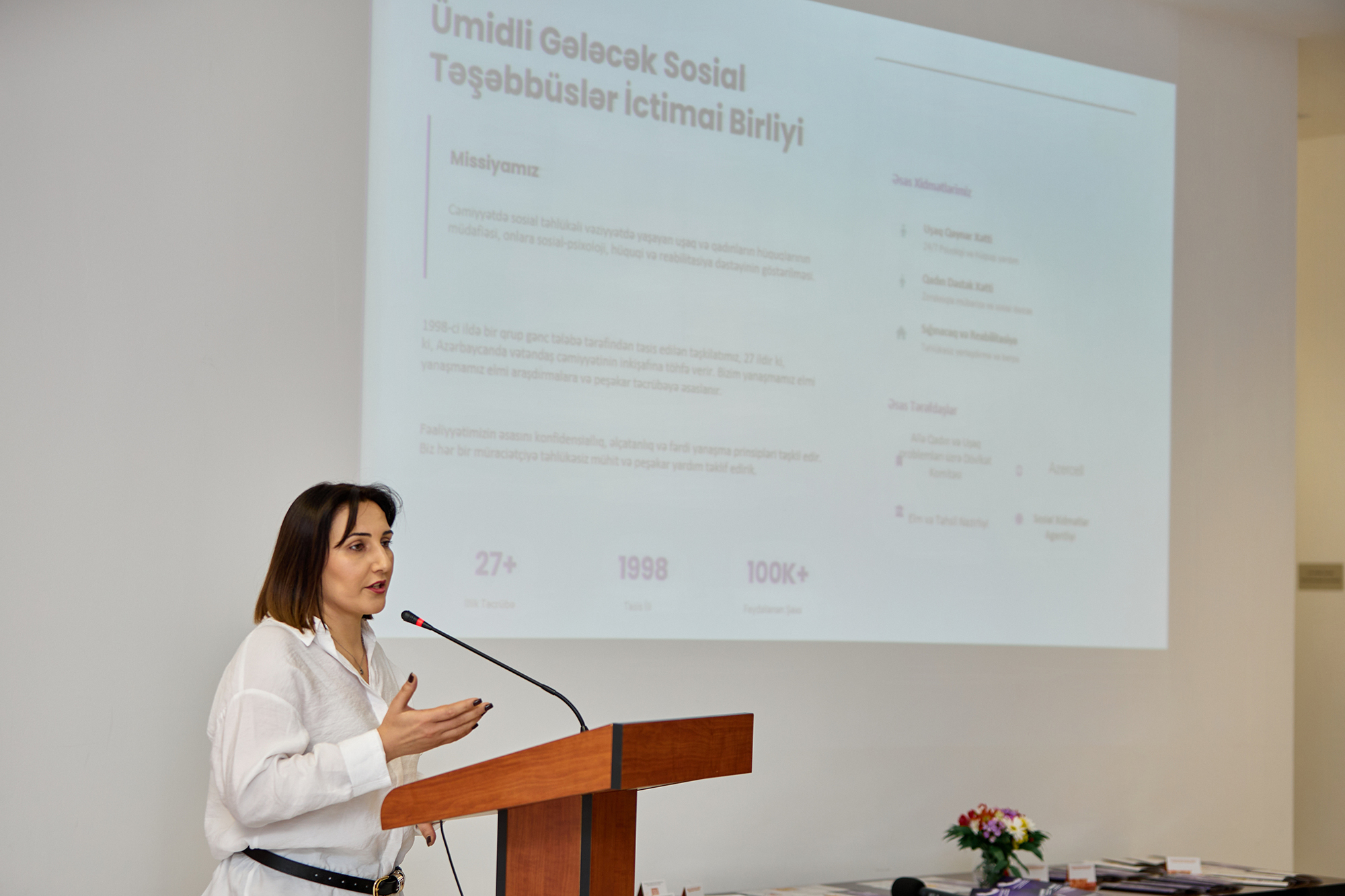 “Ümidli Gələcək” Sosial Təşəbbüslər İctimai Birliyinin rəhbəri Kəmalə Aşumova isə öz növbəsində “Qadın Dəstək Xətti”nin fəaliyyəti barədə tədbir iştirakçılarına ətraflı məlumatı təqdim edib.