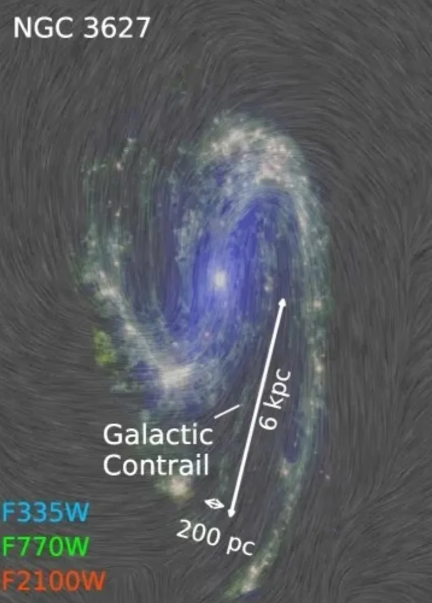 Astronomlar NGC 3627 qalaktikasında çox uzun, lakin eyni zamanda olduqca dar bir inversiya izi aşkar ediblər. Alimlərin fikrincə, bu izi həmin qalaktikanın içindən sürətlə keçmiş nəhəng bir qara dəlik buraxmış ola bilər. Astronomlar James Webb kosmik teleskopu və yerüstü ALMA radioteleskopunun köməyi ilə bizdən 31 milyon işıq ili uzaqlıqda yerləşən spiral formalı NGC 3627 qalaktikasında qaz və tozdan ibarət nəhəng bir inversiya izi müşahidə ediblər. Bu axının uzunluğu təxminən 20 000 işıq ili, eni isə cəmi 650 işıq ilidir. Alimlər hesab edirlər ki, bu iz qalaktikanın içindən keçmiş böyük bir qara dəlik tərəfindən buraxıla bilər, baxmayaraq ki, bu effekti başqa bir obyektin də yaratması mümkündür. Astronomlar daha əvvəl də Süd Yolu qalaktikasında oxşar inversiya izləri müşahidə etmişdilər. Lakin NGC 3627 spiral qalaktikasında aşkar edilmiş bu qaz və toz axını indiyə qədər qeydə alınanların ən aydın və ən iri ölçülü olanıdır.