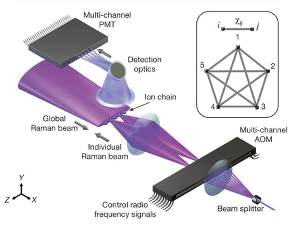 edirlər. Kubitlər ion tələ vasitəsilə saxlanılır və lazerlər vasitəsilə idarə