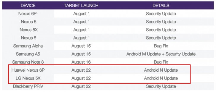 Kanadalı bir operator vasitəsi ilə ortaya çıxan məlumatlara görə, hərkəsə açıq ilk Android 7.0 yenilənməsi, 22 Avqust 2016 tarixində Huawei Nexus 6P və LG Nexus 5P modelləri üçün təqdim ediləcək. Bu cihazlardan sonra növbə Android One platformasındakı cihazlar üçündür.
