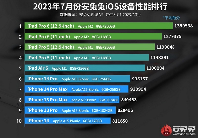 iPad Pro 6 (12.9 düym ekran, M2 prosessoru, 8 GB RAM + 256 GB yaddaş), iPad Pro 6 (11 düym ekran, M2 prosessoru, 8 GB RAM + 128 GB yaddaş), iPad Pro 5 (12.9 düym ekran, M1 prosessoru, 8 GB RAM + 256 GB yaddaş), iPad Pro 5 (11 düym ekran, M1 prosessoru, 8 GB RAM + 128 GB yaddaş) və iPad Air 5 (M1 prosessoru, 8 GB RAM + 128 GB yaddaş). Reytinqin ikinci beşliyinə daxil olan cihazların sıralanması isə belədir. iPhone 14 Pro, iPhone 14 Pro Max, iPhone 13 Pro Max, iPhone 13 Pro və iPhone 14.