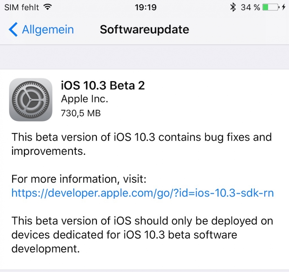 730,5 MB həcmində olan iOS 10.3 Beta 2 yenilənməsiilə