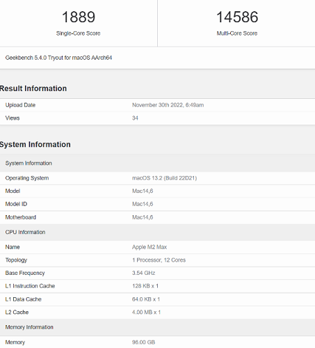 Apple şirkətinin hələ təqdim edilməmiş M2 Max adlı 12 nüvəli prosessoru Geekbench bençmark saytının məlumatlar bazasında ortaya çıxıb. Gözləntilərə əsasən növbəti nəsil MacBook noutbukları məhz sözügedən prosessor ilə təchiz olunacaqlar. M2 Max-ın texniki özəllikləri və nüvələrinin konfiqurasiyaları barəsində hələ heç bir məlumat yoxdur. Lakin məlumdur ki, Apple şirkətinin yeni prosessoru 3.54-3.7 GHz tezlikdə çalışacaq. M2 Max Geekbench-in bir nüvəli testi çərçivəsində 1889 xal, çox nüvəli testi çərçivəsində isə 14 586 xal toplayıb.