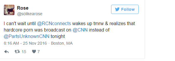 Dünən axşam saat 11 radələrində, bəzi izləyicilər CNN-də "Anthony Bourdain ilə Bilinməyənlər” verilişinin yeni seriyasını gözləyərkən proqramın 30 dəqiqəlik "sərt porno" videosu ilə əvəzləndiyini görüb təəccübləniblər. Hadisə sadəcə Boston şəhərində yaşayan izləyicilər üçün keçərli olub və burada CNN kanalı lokal televiziya yayım şirkəti olan RCN tərəfindən nümayiş etdirilir. Məşhur xəbər kanalı düzgün siqnalı göndərsə də RCN əməkdaşı səhv düyməyə klik edib və izləyicilər gözlədikləri veriliş əvəzinə porno ilə qarşılaşıblar.Twitter istifadəçisi @solikearose, məşhur