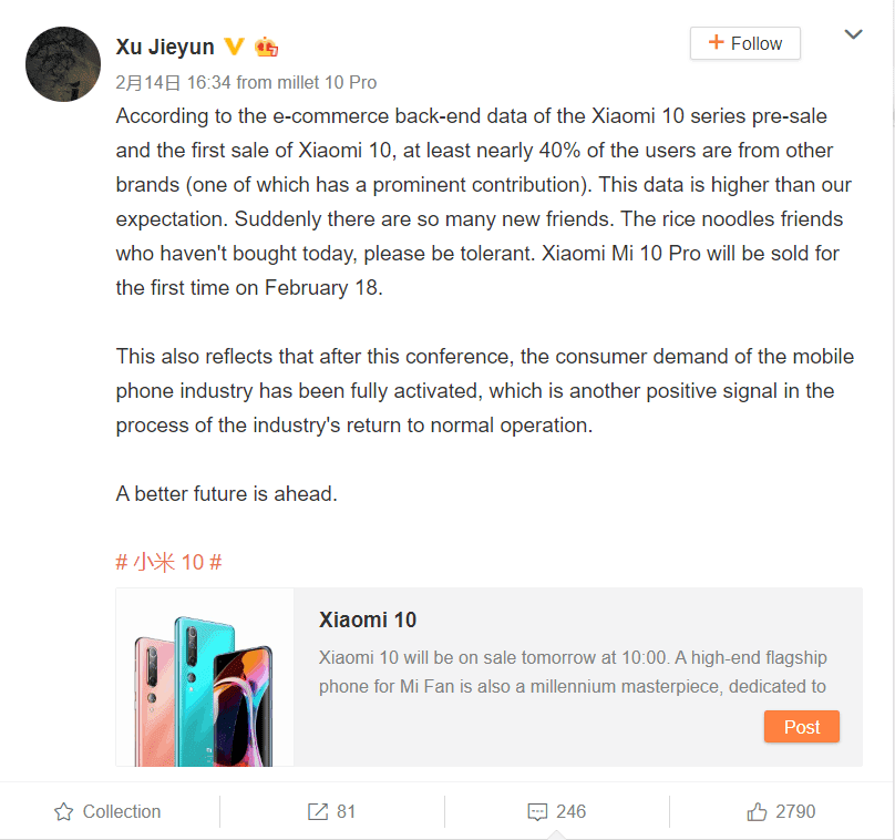 Bir neçə gün bundan öncə təqdim edilmiş Mi 10 flaqman smartfon seriyasının ilk partiyası 1 dəqiqə ərzində satılmışdı. Lakin bu, şirkətin əldə etdiyi yeganə nailiyyət deyil. Belə ki, şirkətin ictimaiyyət ilə əlaqələr şöbəsinin rəhbəri olan Xu Jieyun bildirib ki, Mi 10 seriyasının əldə etdiyi daha bir rekord göstərici əvvəllər digər brendlərin məhsullarına üstünlük verən alıcıların yüksək faiz göstəricisidir. Bu barədə Gizchina saytı xəbər verib. Top menecerin verdiyi məlumata əsasən Mi 10-u ön sifariş etmiş alıcıların 40%-i daha öncədən digər brendlərin məhsullarından istifadə edirdi. Bununla yanaşı o qeyd edib ki, yeni smartfon modelinin satış göstəriciləri şirkətin gözlədiyindən daha yüksək olub.