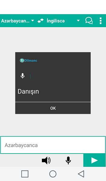3. Şifahi nitqin müxtəlif dillərə yazılı tərcümə olunması bu tətbiqin ən əsas xüsusiyyətlərindən biridir. İstədyiniz 4 dildən birini seçin və həmin dildə nitqi səsləndirin, dilmanc mobil tərcüməçi dərhal səsləndirdiyiniz nitqi ayırd edir və sizə lazım olan dilə keyfiyyətli tərcümə edir. Lakin burada nitqi səsləndirən zaman sözlərin düzgün tələffüz olunmasına xüsusilə diqqət etməlisiniz. Əks halda proqram sizin nitqinizi başa düşməyə bilər.