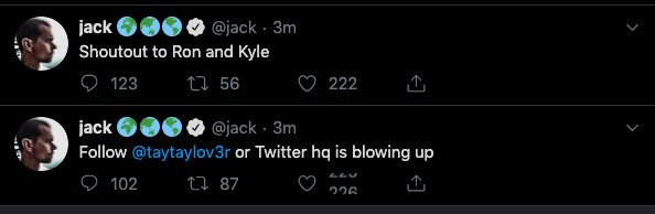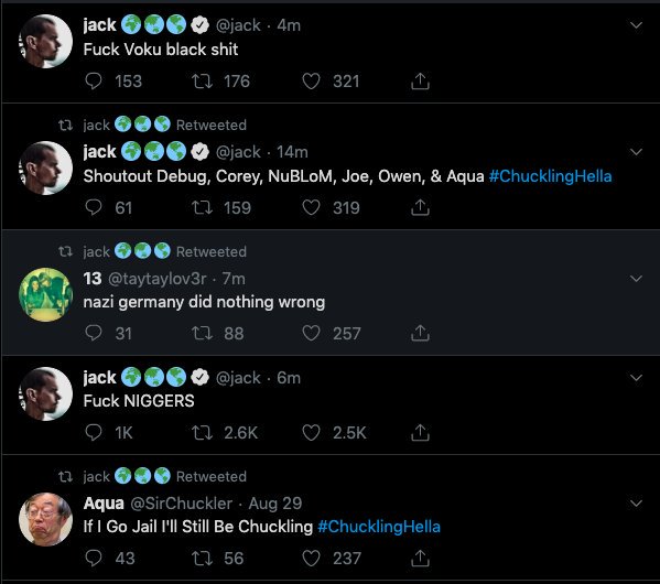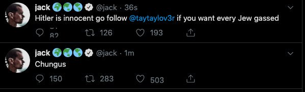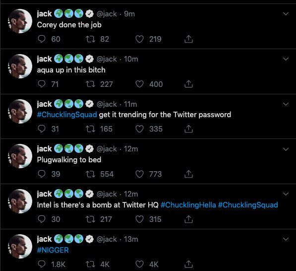 15 dəqiqə ərzində hackerlər Jack Dorsey-nin istifadəçi hesabında partladılma təhdidlərini, rasizmi, qeyri-normativ leksikona aid sözləri, Holokostu və təhqiredici sözləri əhatə edən paylaşımlar ediblər. Qısa müddətdən sonra isə sosial şəbəkənin administrasiyası istifadəçi hesabı üzərində idarəetməni bərpa edib və yazılmış bütün tweet-ləri silib. Sözügedən kiberhücumu Chuckling Squad adlı hacker qruplaşması öz üzərinə götürüb.