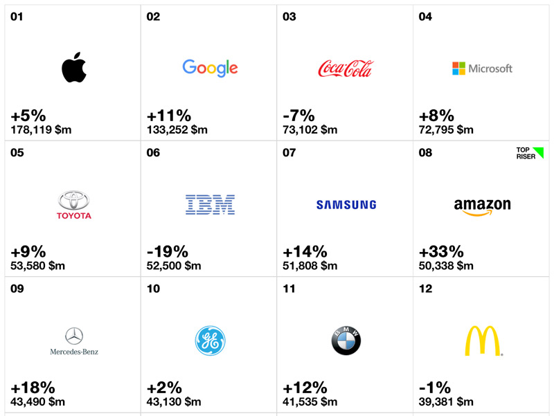 vaxtlar bu siyahıda lider olmuş "Coca-Cola” isə 3-cü yeri tutub. Onun qiyməti 73 milyard dollar (-7%) təşkil edir.