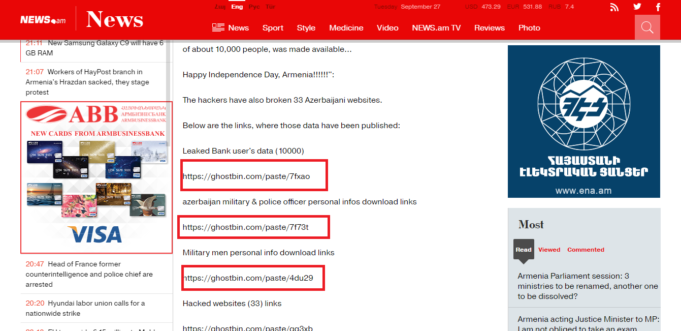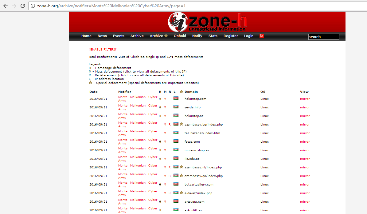 Digər bir mənbədə isə 21 sentyabr tarixində Azərbaycan saytlarının hack edilməsi barədə məlumat yerləşdirilib. Hack edilən saytların isə ciddi dövlət qurumları saytları olduğunu iddia edən erməni tərəfi məhz bu saytlar vasitəsilə ilə məlumatları əldə etdiklərini dəlil kimi göstəriblər. Yerləşdirilən saytların siyahısına nəzər saldıqda isə burada zabitlərin məlumatlarını daşıyan hər hansı ciddi dövlət qurumu saytının olmadığı açıq-aydın görünür.