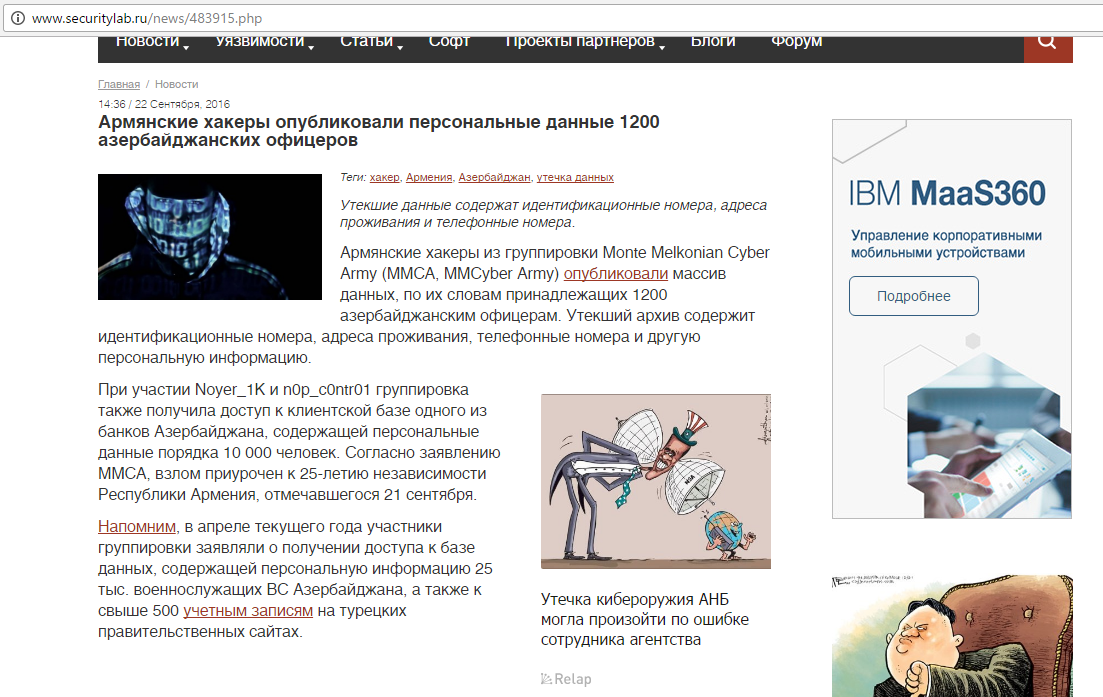 25 sentyabr tarixində "securitylab.ru" saytına istinadən yerləşdirdiyimiz məlumatda ermənilərin, azərbaycanlı 1200 zabitin əlaqə məlumatlarını, yaşayış ünvanlarını və 10.000 şəxsə məxsus bank hesablarını ələ keçirildiyi iddia olunmuşdu. Eyni xəbər erməni təxribatı nəticəsində hacker xəbərləri ilə məşhurlaşan "hackread.com" saytında da yayımlanmışdı. Apardığımız araşdırmalara əsasən yayılan məlumatın saxta olduğunu sizlərə izah edirik. Eyni zamanda əvvəl ki, yerləşdirilmiş xəbəri saytımızda yayımdan qaldırırıq. Biz xəbəri "securitylab.ru" və "hackread.com" mənbələrinin istinadı ilə tərcümə olaraq oxucularımıza çatdırmışıq və yayılan dezinformasiyaya görə oxucularımızdan üzr istəyirik.