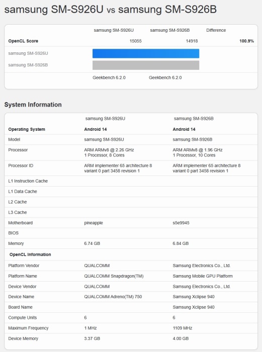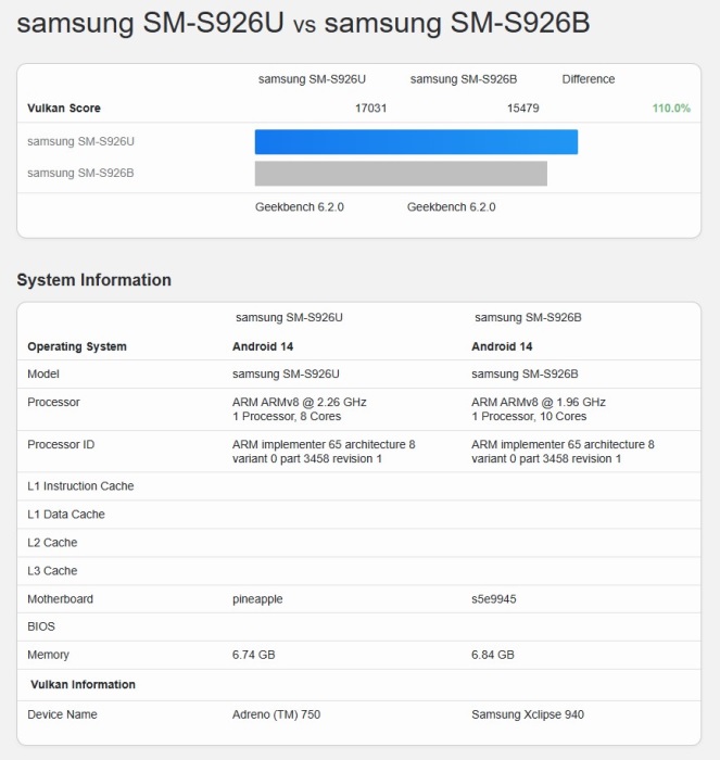 Qeyd etmək lazımdır ki, Exynos 2400-da AMD şirkəti ilə birgə hazırlanmış Xclipse 940 qrafik çipi, Snapdragon 8 Gen 3-də isə Adreno 750 adlı qrafik çipdən istifadə edilir. Beləliklə ilk növbədə aparılmış OpenCL testi çərçivəsində Galaxy S24+ smartfonu 14 918 xal, Galaxy S24 Ultra smartfonu isə 15 055 xal toplayıb. Qrafik çiplərin bu nəticələri arasındakı fərq sadəcə 0.9% təşkil edir. Vulkan testində isə nəticələr bir qədər fərqli olublar. Belə ki, Vulkan testi çərçivəsində Galaxy S24+ modeli 15 479 xal, Galaxy S24 Ultra modeli isə 17 031 xal toplayıb. Beləliklə Vulkan testləri çərçivəsində Galaxy S24 Ultra modeli Galaxy S24+ modelindən 10% daha üstün olub.