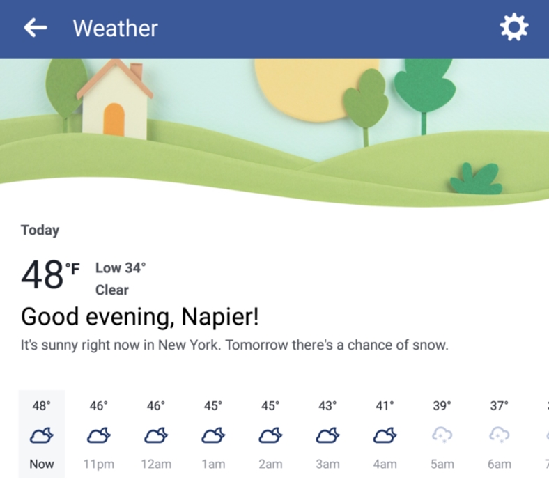 Son vaxtlarda hava proqnozu məlumatı verən Facebook, bu cəhdini biraz daha irəli apararaq sosial şəbəkəyə əsl bir hava proqnozu tətbiqi inteqrasiya edir. Beləcə daha detallı hava proqnozu məlumatını hər gün Facebookdan öyrənə biləcəksiniz.