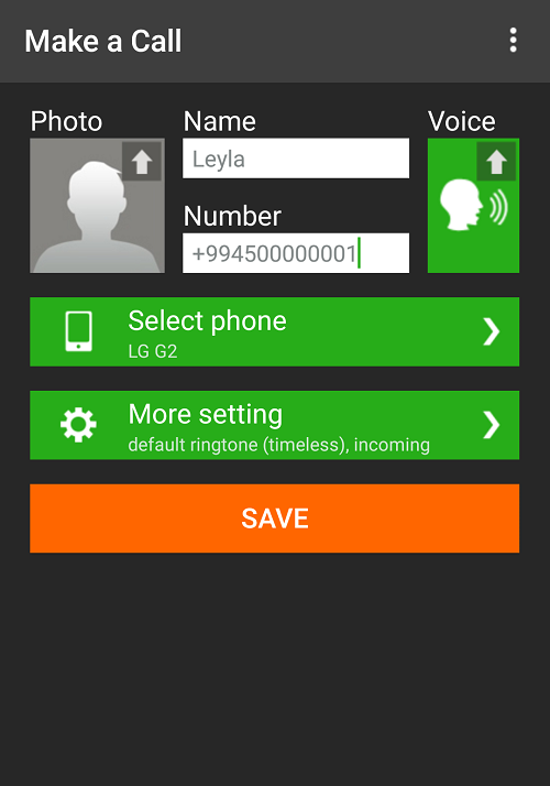 "Name and Number" hissəsinə sizə zəng gəlməsini istədiyiniz şəxsin ad və nömrəsini qeyd edirsiniz. "Select Phone" bölməsindən telefon modelinizi seçirsiniz. Bunun məqsədi həmin tətbiqin sizin smartfonun interfeysinə uyğun saxta zəng hazırlamasıdır. "More settings" bölməsində isə bir çox tənzimləmə həyata keçirmək mümkündür. Buradan siz, danışıq müddətin, təkrar zəng göstəricilərin nizamlaya bilərsiniz. Son olaraq "Save" düyməsinə basıb, gələcək zəngin vaxtın təyin edirsiniz. Məsələn, 10 saniyə. 10 saniyə sonra sizə qeyd olunan ad və nömrədən zəng gəlir.