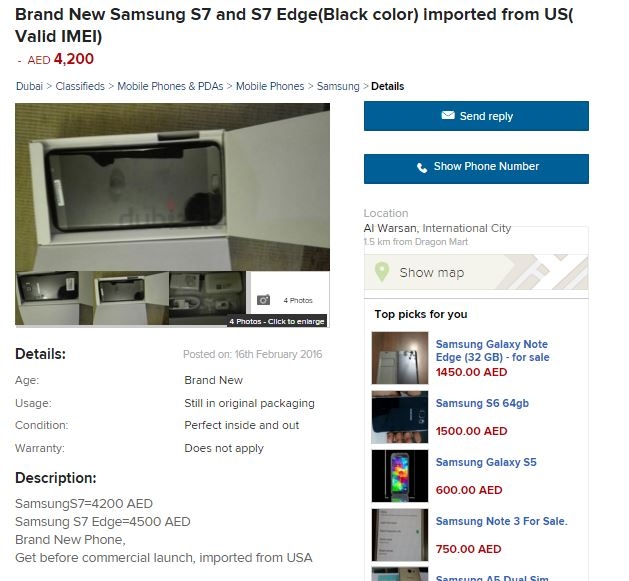 Dubay online ticarət mağazı olan Dubizzle üzərindən 1 gün müddətində Galaxy S7 satışa çıxarılıb. 1 gün sonra satışdan çıxarılmasına baxmayaraq elandan Galaxy S7'nin qutusu və dizaynı açıq-aşkar görünür. 1 gün sonra yığışdırılmasına baxmayaraq sözügedən elan, görünən odur ki, sahibinin və ticarət mağazasının başına bəla olacaq.