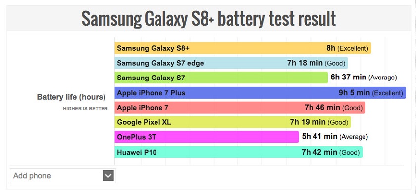 edib. İkinci yerdə Samsung Galaxy S8+ (8 saat), 3-cü yerdə iPhone 7 (7 saat 47 dəqiqə),
