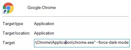Əgər siz gözləmək istəmirsinizsə onda Dark Theme rejimini özünüz aktiv edə bilərsiniz. Bunun üçün siçanın sağ düyməsi vasitəsilə Chrome brauzerinin loqosunun üzərinə klik edirsiniz. Daha sonra Shortcut bölməsində Target adlı hissəni tapırıq və ordakı yazının sonuna “-force-dark-mode” yazısını əlavə edib brauzeri yenidən işə salırıq. Bu proseslərdən sonra Chrome brauzerindəki Dark Theme rejimi avtomatik olaraq işə düşməlidir.