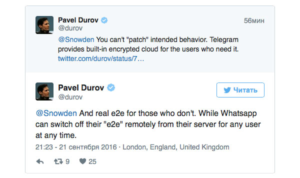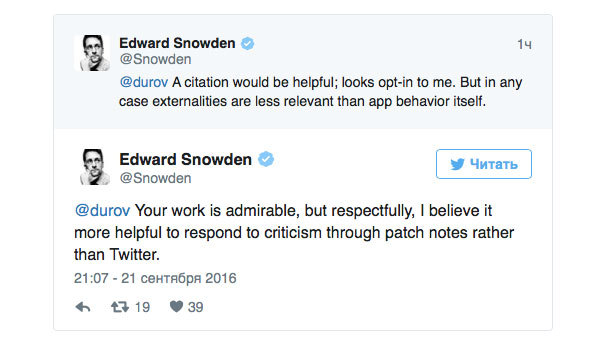 olduğunu bildirərək WhatsApp-ın zəif nöqtələrini qeyd edib. Məlumata əsasən Twitter istifadəçilərindən biri Edvard Snouden-dən Pavel Durov-un yaratdığı TeleGram