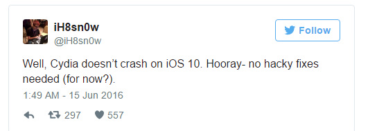 Məşhur iPhone hacker-i iH8sn0w Twitter üzərindən etdiyi açıqlamada iOS 10 yüklü iPhone-da Cydia-nı işlətməyi bacardığını yazıb.
