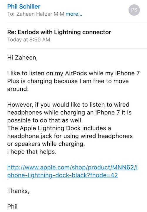 Fil Şiller ilk olaraq AirPods-u təklif edir. Bundan əlavə o, yeni təqdim edilən və satışa buraxılan Apple Lightning Docku da təklif edir. 49 dollardan satışa qoyulan bu Dock vasitəsilə iPhone-unuzu həm şarj edə bilər həm də qulaqlıq ilə musiqi dinləyə bilərsiniz.