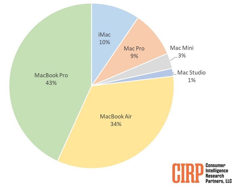 Lakin CIRP tərəfindən aparılmış sorğu onu göstərib ki, bütün dünyada Apple şirkətinin ən çox yayılmış Mac kompüteri MacBook Air deyil, daha baha qiymətə satılan MacBook Pro-dur. MacBook Air-də bu göstərici 34%, MacBook Pro-da isə 43% təşkil edir. Bununla yanaşı Apple kompüterlərinin arasında noutbukların pay göstəricisi keçən ildən 3% yüksələrək 77%-ə çatıb. Öncədən güman etmək olardı ki, istifadəçilər arasında Apple şirkətinin desktop kompüterləri üzrə ən məşhur olanı aşağı qiymətə satılan Mac mini-dir. Lakin məlum olub ki, onun Apple istifadəçiləri arasında pay göstəricisi cəmi 3% təşkil edir. İstifadəçilərin çoxu isə Mac Pro-ya (9%) və ya iMac-a (10%) üstünlük verir.