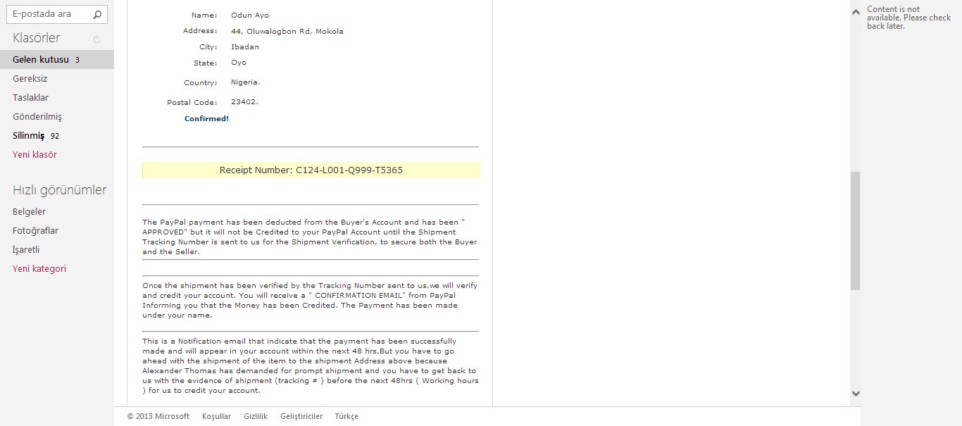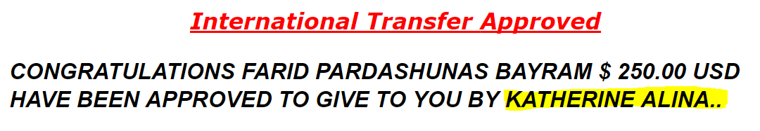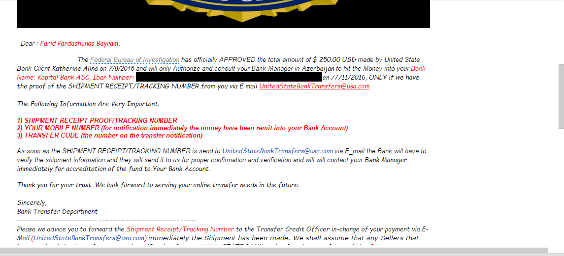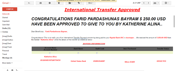 Lakin mən yenidən həmin xanım ilə əlaqə saxlayıb sürətli pul köçürmə ilə ödənişi almaq istədiyimi dedim və qeyd etdim ki, bizim hesab şirkət hesabıdır əlavə vergiyə cəlb olunmağımı istəmirəm. Bunu eşidən xanım artıq əməliyyat başlanıb və ləğv etmək uzun sürəcək dedi. İlk şübhəm buradan yarandı. Məhsulu tam hazırlayıb poçta aparmaq istəyirdim ki, bankda işləyən bir dostumla əlaqə saxlamağı özümə məsləhət bildim. Baş verən proseduru dostuma danışdım. O isə belə bir ödəniş metodunun yalnız əvvəlcədən razılaşdırılmış və iri məbləğlərin göndərişləri halında baş verdiyi mənə izah etdi. Çünki, adamın əməliyyatı ləğvetmə ehtimalı vardı. Yenidən mailə qayıdıb dəfələrlə bir səhv tapmaq üçün çalışdım. Hər şey qaydasında olduğu bir anda gözümə çox qəribə bir detal dəydi. Belə ki, ödənişi edən şəxs KATHERINE ALINA idi.