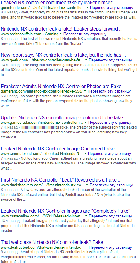 Bu yaxınlarda internetdə yayılmış və Nintendo şirkətinin yeni konsolu olacaq Nintendo NX üçün güman olunmuş gamepad fotoları fake çıxdı. Belə qənaətə gəlmək olar ki, bir müddət öncə həmin fotolara bənzəyən digər versiyalar da fake imiş. Fake çıxmış həmin fotolar müəyyən istifadəçi tərəfindən photoshopda hazırlanıb. 24 martdan 25 marta keçən gecə həmin istifadəçi photoshop ilə fotonun necə hazırladığı haqqında videonu öz kanalında təqdim edərək bunu etiraf edib. Qeyd etmək lazımdır ki, fotolar ilk dəfə təqdim olunan zaman onlar bütün internetə yayılmışdı. Onları hətda nüfuzlu oyun mətbuatları belə dərc etmişdilər. Təkcə Neogaf forumunda həmin fotolar 2 milyona yaxın baxış sayı yığmışdır. İstifadəçilər sözün əsl mənasında "yeni gamepad-ları" müzakirə edirdlər. Fotoların fake olması ilə bağlı xəbər yayılandan sonra müxtəlif forumlarda mütəxəssislər bu xəbəri təsdiqləyiblər. İlk videoda siz Idriss2Dev adlı istifadəçi tərəfindən hazırlanmış fake fotonu, ikinci videoda isə Bravu adlı istifadəçi tərəfindən hazırlanmış fake prototipi görə bilərsiniz. Nintendo NX konsolunun rəsmi təqdmatı isə bu il üçün gözlənilir.