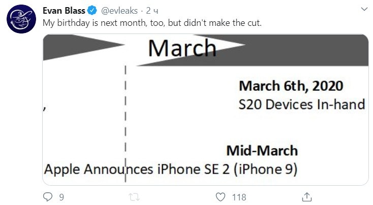 Daha öncədən olmuş bir çox məlumat sızıntısı iPhone SE-nin davamçısının yaxın müddətdə təqdim olunacağına işarə edirdi. Lakin bir çox insayderlər təqdimatın dəqiq tarixi məsələsində mübahisə edirdilər. Məşhur insayder Evan Blass isə bu mübahisələrə son qoymaq qərarını verdi. Beləliklə onun verdiyi məlumata əsasən iPhone SE-nin davamçısı mart aynın ortasında təqdim olunacaq. Bu barədə Slashgear saytı xəbər verib. Maraqlısı ondadır ki, təqdim olunacaq yeni iPhone modelini Evan Blass iki ad ilə qeyd edib. Həm iPhone SE 2 həm də iPhone 9. İnsayder smartfonun texniki özəllikləri və onun hansı qiymətə satılacağı barəsində bir məlumat verməyib.