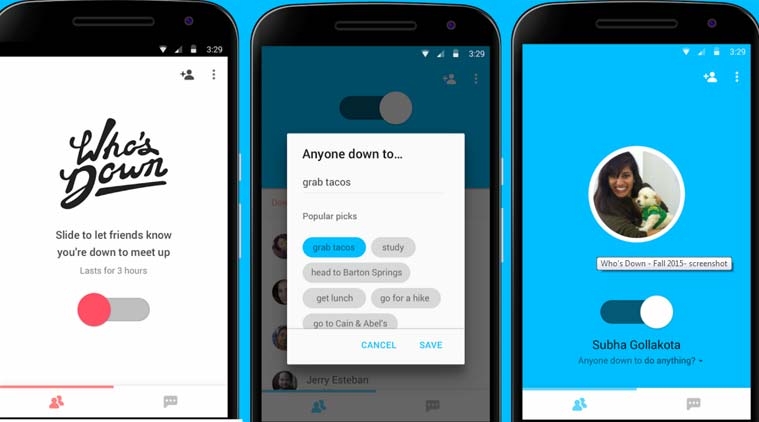 Google’ın onlayn söhbət tətbiqi olan "Who’s Down”, klassik məkan rejimini açmaqla yaxınlıqda olan istifadəçilərlə əlaqə yaratmağa imkan verir. Google Play Store’da pulsuz olaraq yayımlanan tətbiq yalnız Android əməliyyat sisteminə malik cihazlar üçündür.