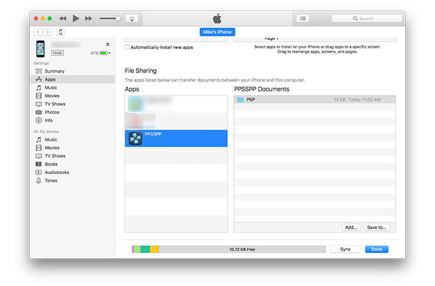 oyununun ISO və ya CSO formatlı versiyasını tapın və iPhone/iPad-ı kompüterə qoşun. iTunes vasitəsilə isə (Programs bölməsindən) oyunu emulyatora yükləyin.