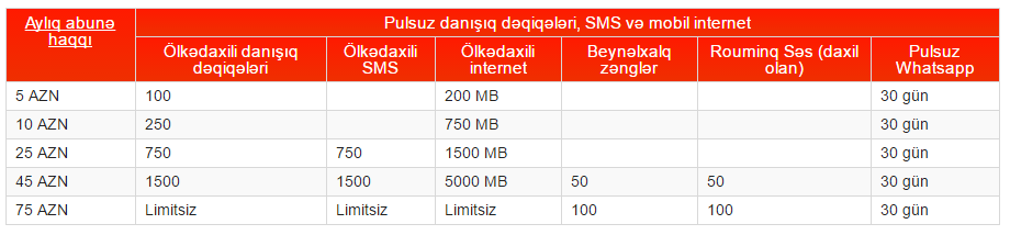 Bu yeni tariflərə qoşulan bütün abunəçilər Whatsapp tətbiqinə pulsuz qoşulmaq imkanına da malik olacaqlar.