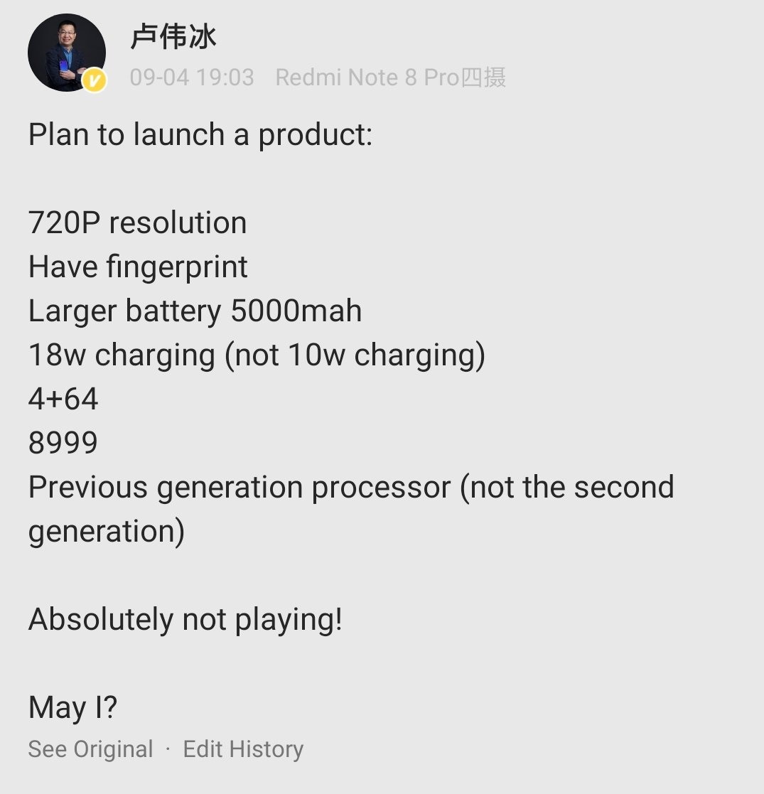 Redmi Note 8 smartfon seriyasının təqdimatından sonra Redmi brendi uzunmüddətli fasilə etməyərək öz yeni smartfon seriyasının təqdimatına hazırlaşır. Belə ki, Redmi brendinin rəhbəri olan Liu Weibing şirkətin yeni smartfon modeli barəsində məlumatlar verib. Yeni smartfonda diqqəti ən çox çəkən isə onun batareya həcmi ilə qiymətidir. Bu barədə 4pda saytı xəbər verib.