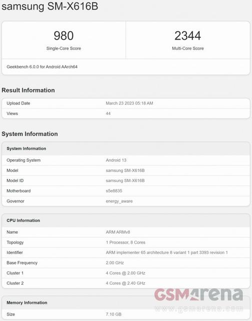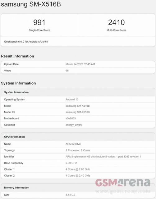 SM-X516B model nömrəsinə sahib planşet 2 GB RAM-a sahibdir və o, Geekbench 6-nın bir nüvəli testi çərçivəsində 991 xal, çox nüvəli testi çərçivəsində isə 2410 xal toplayıb. Bu model nömrələrindən hansının Galaxy Tab S9 FE-yə, hansının Tab S9 Lite modelinə aid olduğunu söyləmək çətindir. Belə ki, Galaxy Tab S8 seriyasında FE və Lite modellər olmadığından yeni planşetlərin model nömrələrini fərqləndirmək olmur.