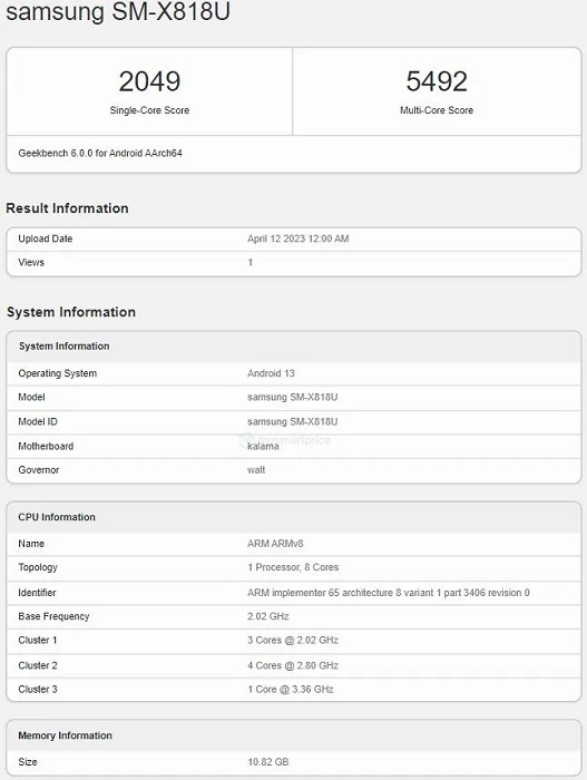 Beləliklə Galaxy Tab S9+ planşeti Geekbench-in bir nüvəli testi çərçivəsində 2049 xal, çox nüvəli testi çərçivəsində isə 5492 xal toplayıb. Geekbench testlərindən planşetin 12 GB RAM-a sahib versiyası keçib. Nüvələrin paylanması və standart rejimdə çalışma tezliyi göstəricisinə əsasən demək olar ki, Galaxy Tab S9+ modeli Snapdragon 8 Gen 2-nin sürətləndirilmiş versiyası vasitəsilə çalışacaq. Söhbət, Snapdragon 8 Gen 2 for Galaxy prosessorundan gedir. Qeyd etmək lazımdır ki, Galaxy S23 smartfon seriyasının bütün modelləri də məhz bu prosessor vasitəsilə çalışırlar. Galaxy Tab S9 planşet seriyasının yay fəslinin sonunda təqdim ediləcəyi gözlənilir.