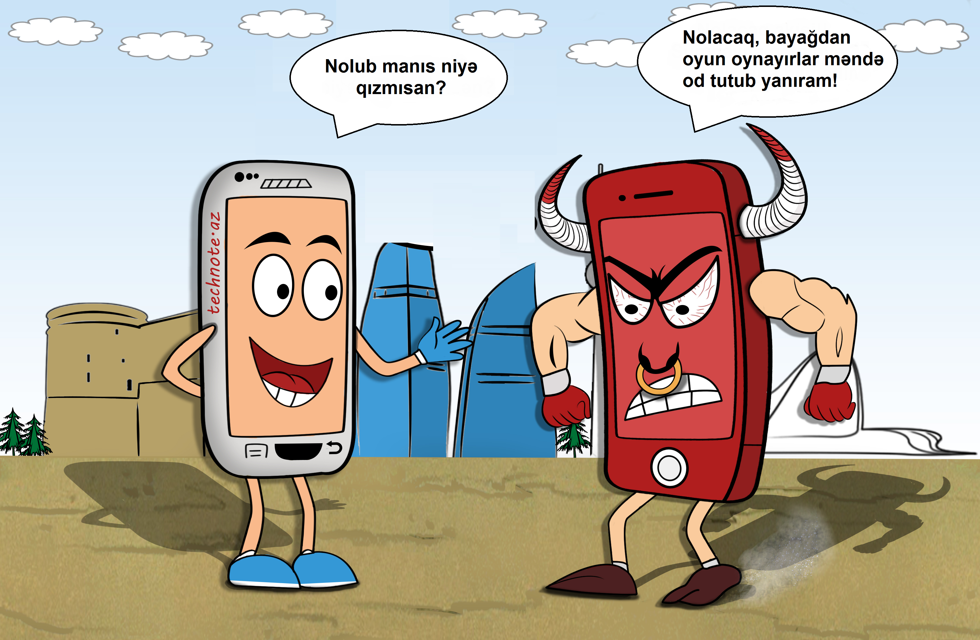 Samsung və iPhone-da yaşanan qızma problemi ilə bağlı karikatura.